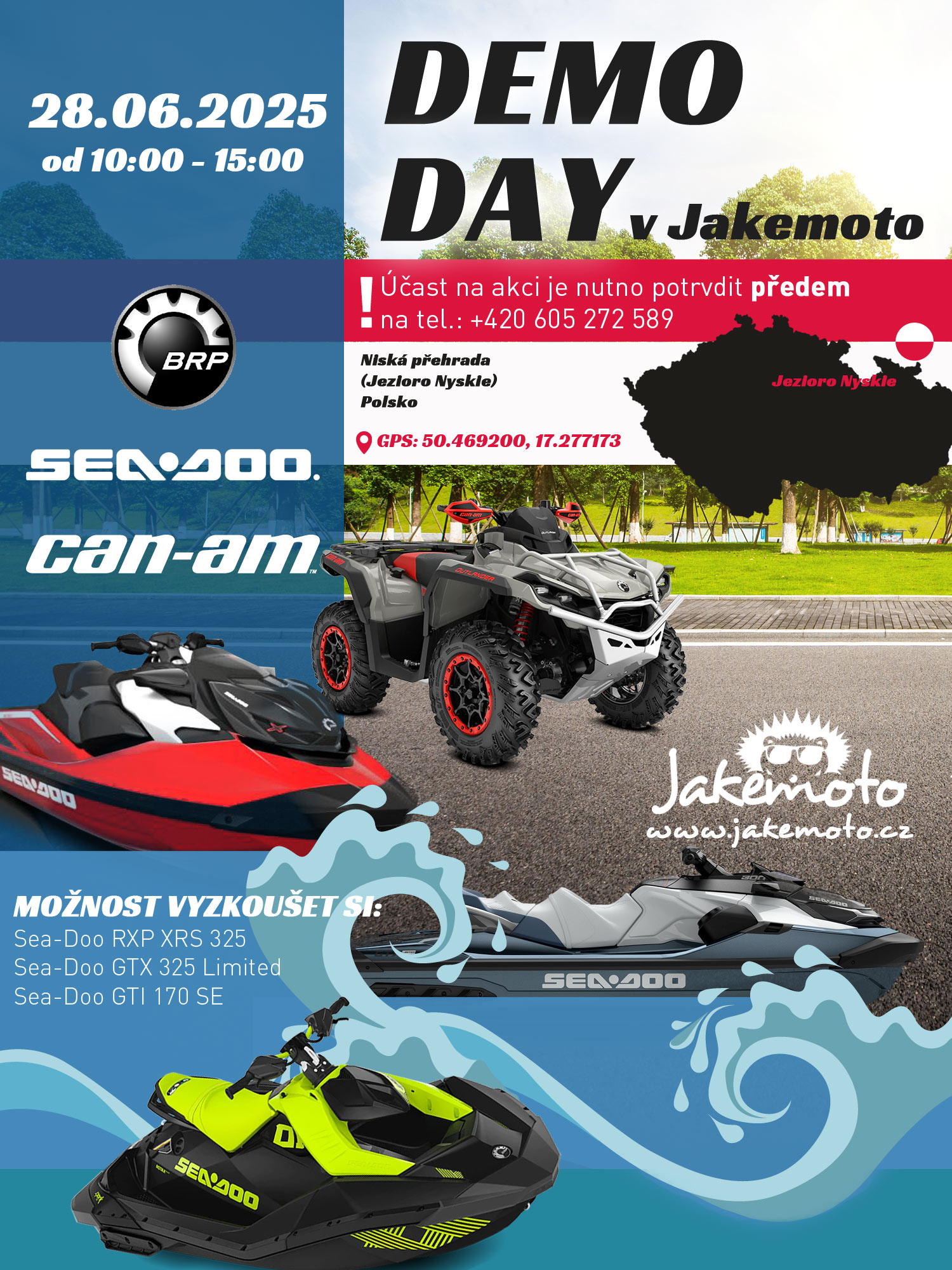 firma Jakemoto vás zve na testovací jízdy vodních skútrů Sea-Doo na polském jezeře Nyskie. Akce proběhne 28. 6. 2025 od 10 do 15 hodin. Účast na akci je nutné potvrdit předem na telefoním čísle +420 605 272 589.